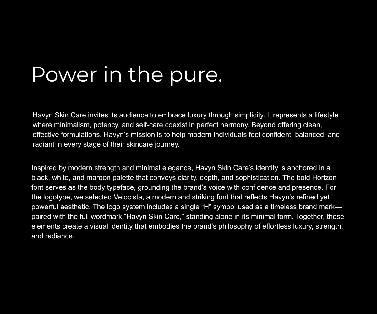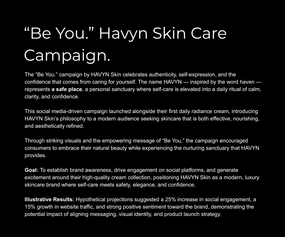 I created the name Havyn to convey serenity, elegance, and rejuvenation, and designed a modern, approachable identity that communicates trust and luxury. My role included naming, logo design, soft neutral color palette, refined typography, packaging mockups, and campaign visuals. The result is a cohesive system that builds credibility, inspires confidence, and positions Havyn as a standout leader in the skincare industry.